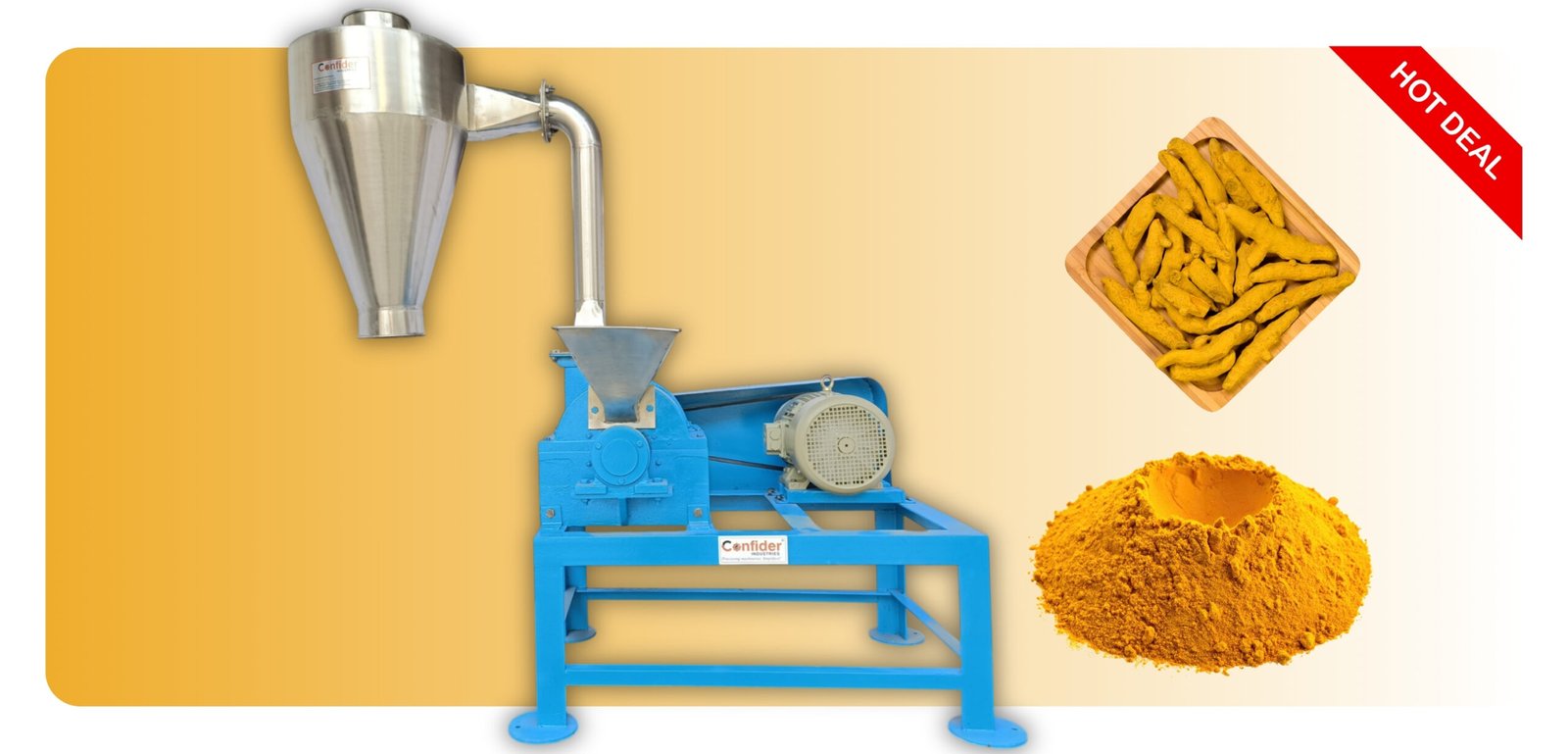 - Confider Industries manufactures a quality turmeric grinding machine which can grind all types of turmeric in an efficient way.