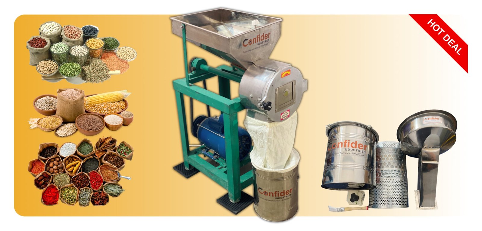 Confider industries manufactures Pulverizer machines. You can call on +91 9909998977 for the price of a Flour mill and Spice mill machine that specifically caters your needs. The team will guide you for any query regarding purchase of the Automatic Spice and Grains Grinding Machine with the best price.