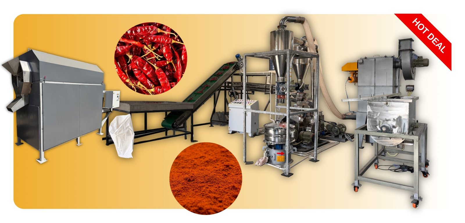 Confider industries manufactures Chilli Grinding Plant with capacities from 100 kg/hr to 1000 kg/hr. Our plants help you achieve faster ROI with its optimum cost, efficient operation, prompt support, and quality manufacturing. The team will guide you for any query regarding Chilli Grinding Plant. Chase your dream to become a global masala powder supplier in lucrative global spice market with our fully automatic chilli powder making processing line.