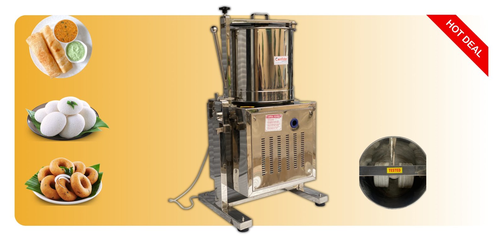 Confider industriesmanufactures Automatic Wet Grinder Machines. You can call on +91 9909998977for the price of a Wet Grinder that specifically caters your needs. The team will guide you for any query regarding purchase of the Automatic wet grinder machine with the best price.
